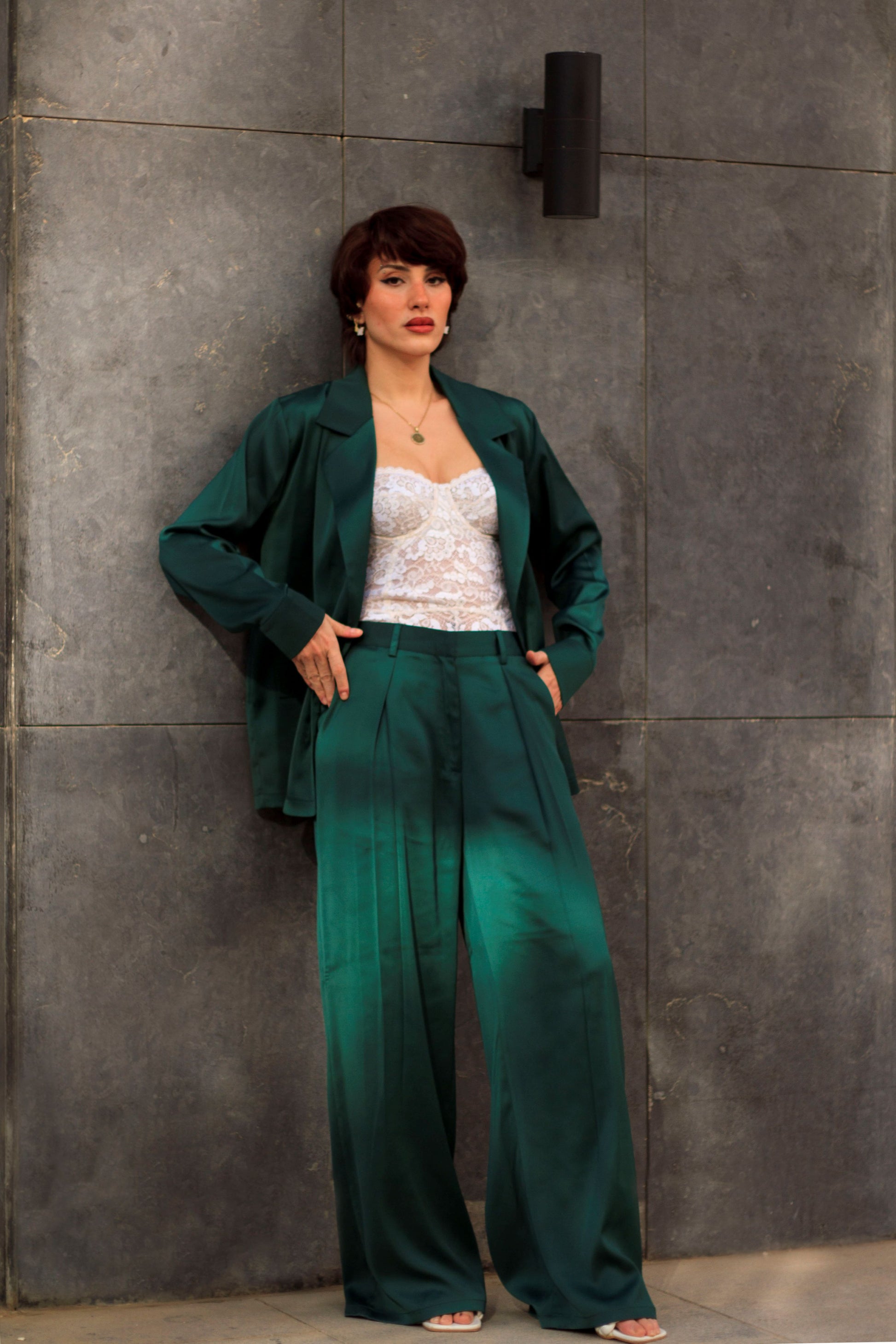 Effortless elegance meets modern tailoring. These wide-leg satin pants are crafted from fluid emerald fabric that drapes beautifully with every movement. Designed with a flattering high waist and soft pleats, they create a relaxed yet polished silhouette.